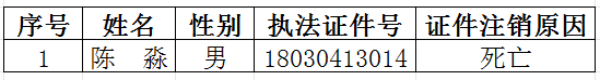 為全面加強行政執法證件管理,根據《湖南省行政執法人員和行政輔助人員管理辦法》的有關規定,對因退休、離職、死亡、其他等原因的以下1名行政執法人員所持有的行政執法證件予以注銷。