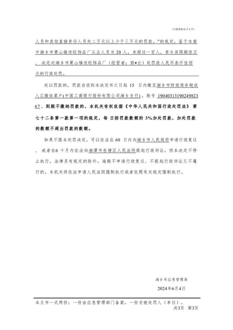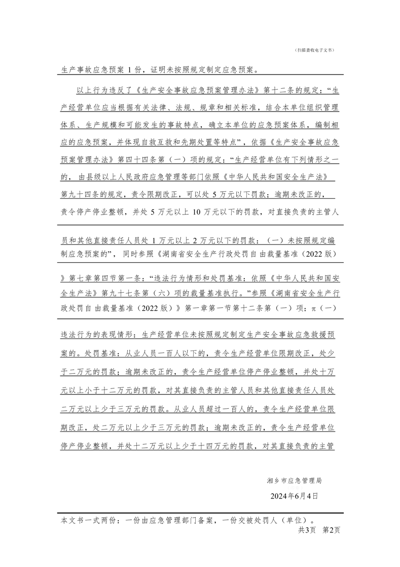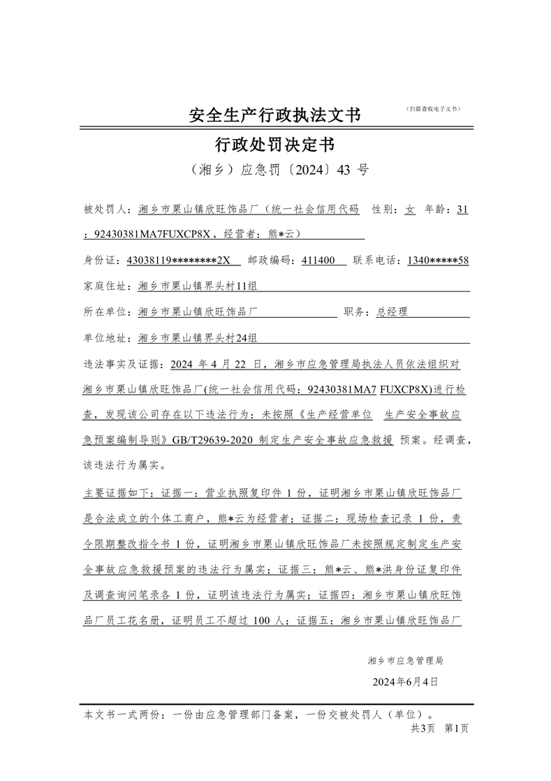 行政處罰決定書 (湘鄉(xiāng))應(yīng)急罰〔2024〕43 號