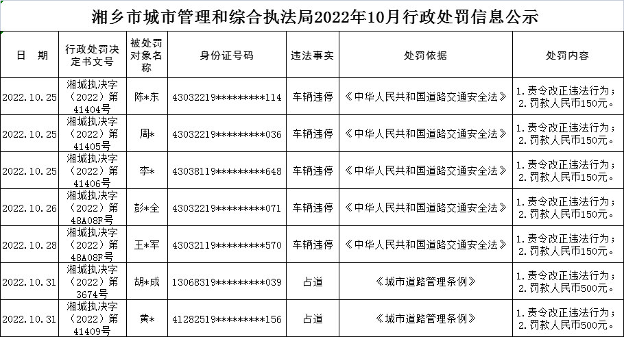 湘鄉市城市管理和綜合執法局2022年10月29日行政處罰公示