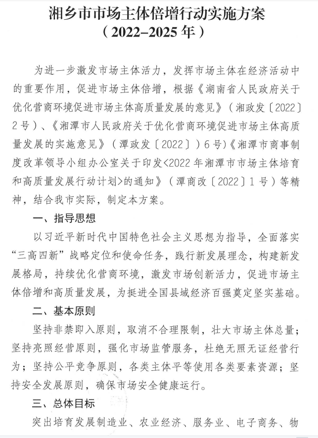 湘鄉市市場主體倍增行動實施方案(2022-2025)