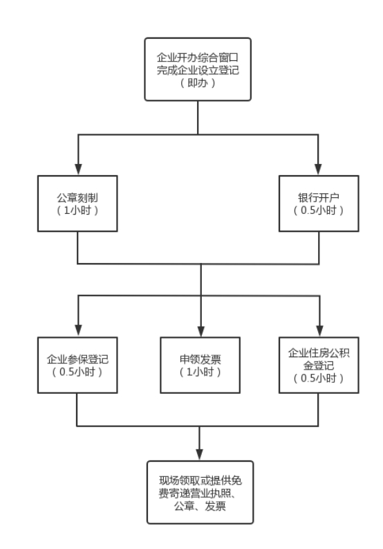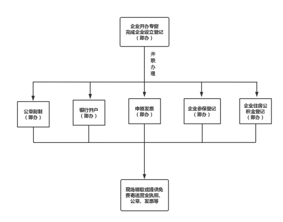 1.現場申請的,申請人在企業開辦服務專窗提交所需聯辦事項材料。由企業開辦專窗綜合受理,當即辦理營業執照,通過信息推送或幫代辦方式,并聯辦理公章刻制、銀行開戶、發票申領、企業參保登記、企業住房公積金登記;申請人在專窗統一領取辦理結果或者通過免費寄遞方式統一郵寄。