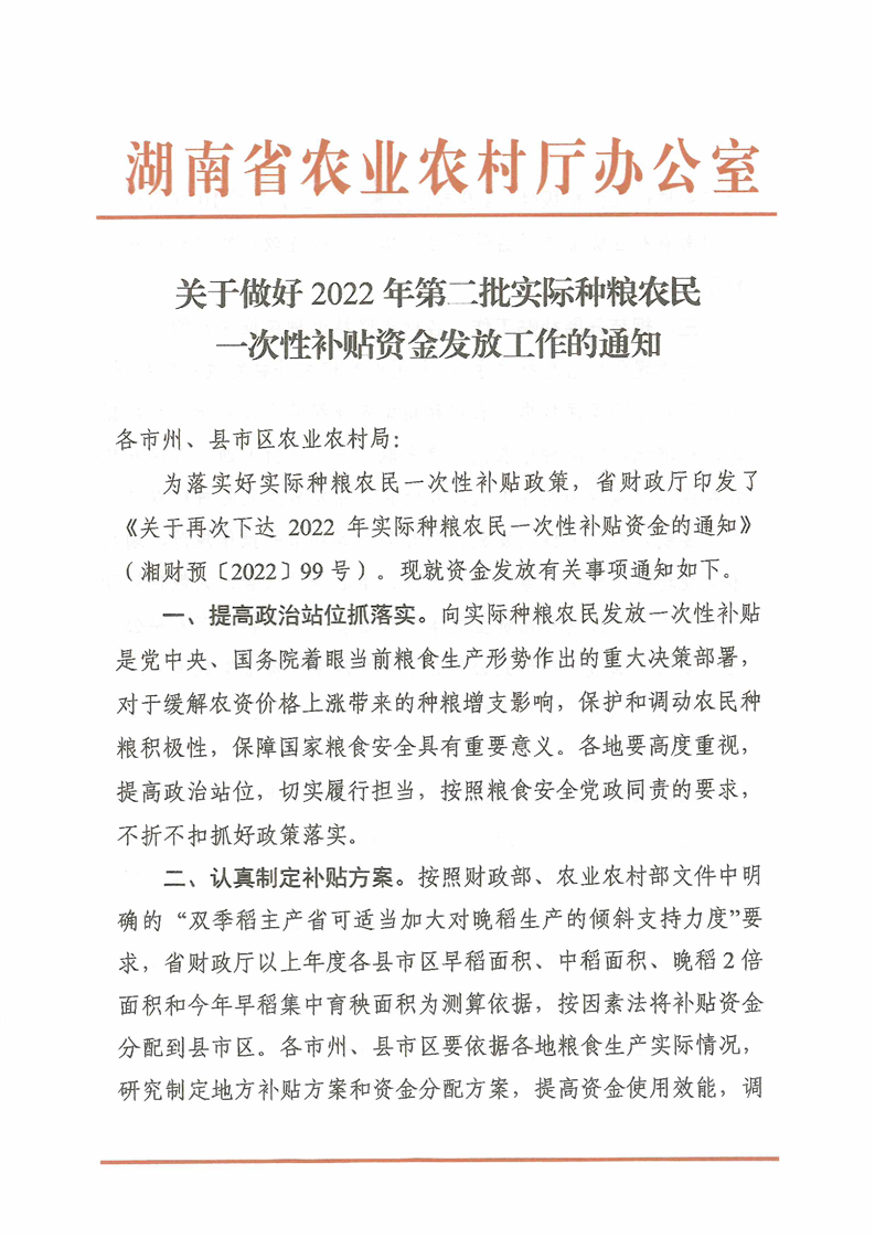 關于做好2022年第二批實際種糧農民一次性補貼資金發放工作的通知