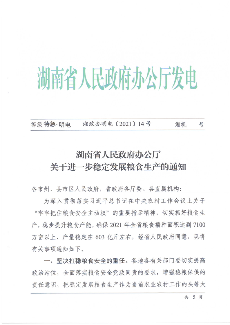湖南省人民政府辦公廳關(guān)于進一步穩(wěn)定發(fā)展糧食生產(chǎn)的通知