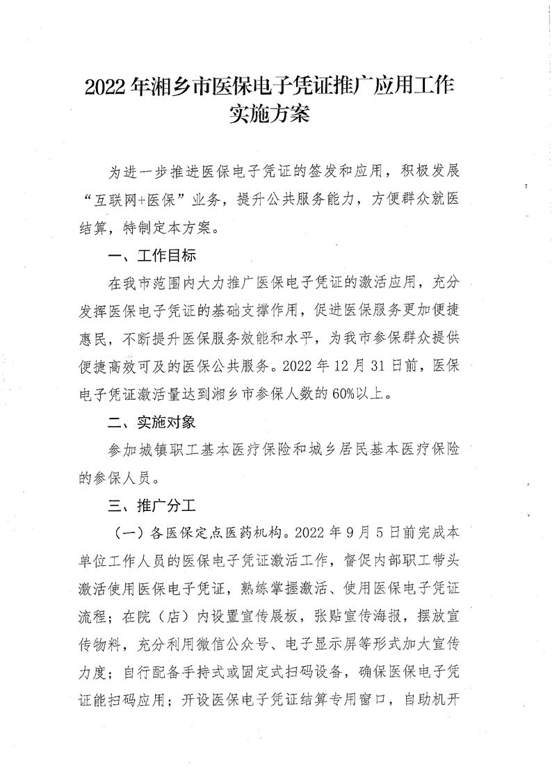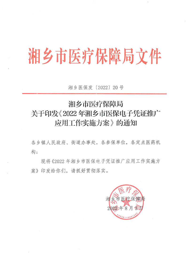 湘鄉市醫療保障局 關于印發《湘鄉市醫保電子憑證推廣實施方案》的通知(湘鄉醫保發【2022】20號)